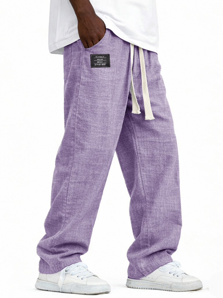 Men's Fashionable Casual Linen Pants with Elastic Waist, Embroidered Logo Pockets