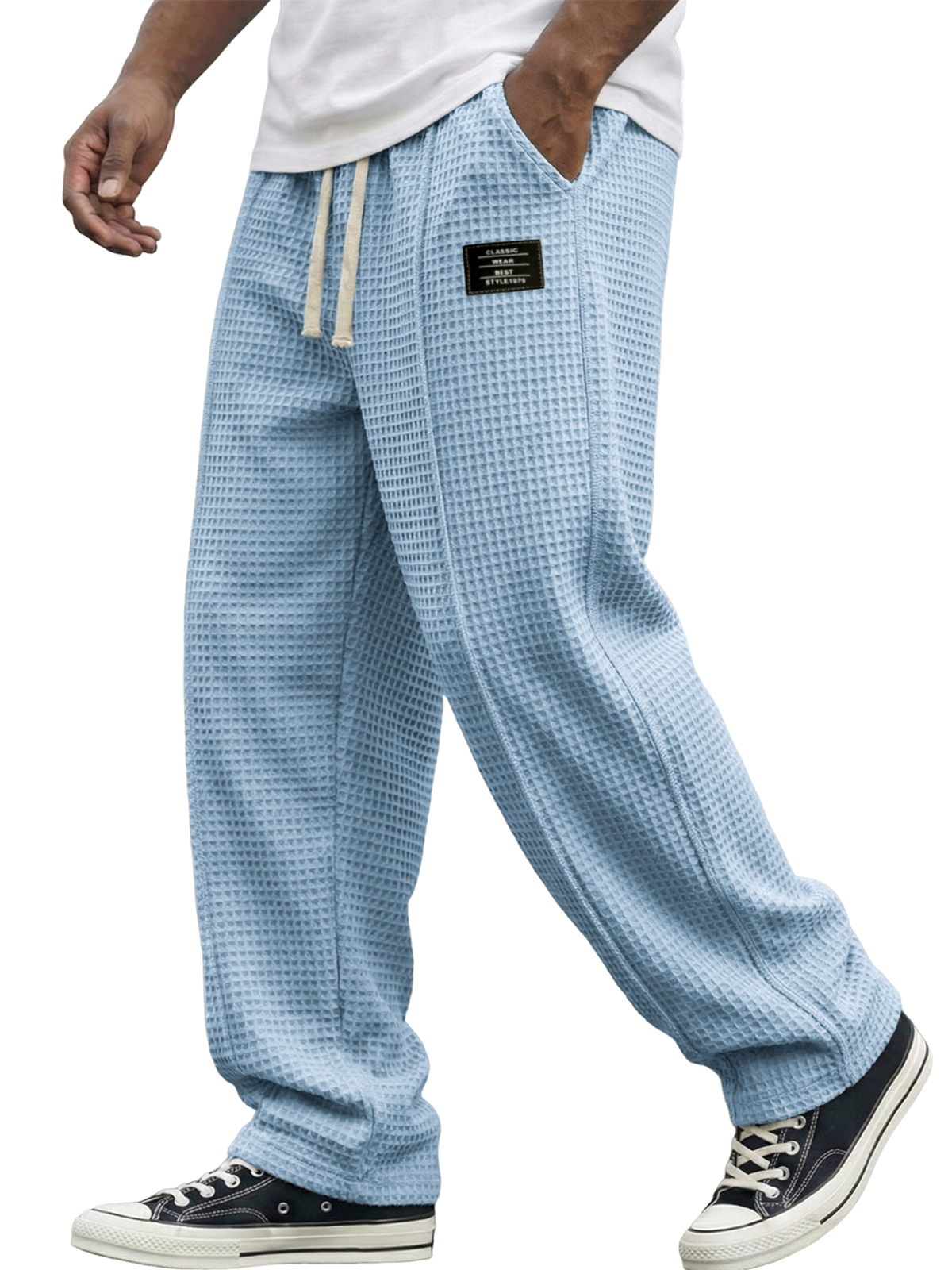 Men's Waffle Textured Pants with Decorative Stitching and Embroidered Label